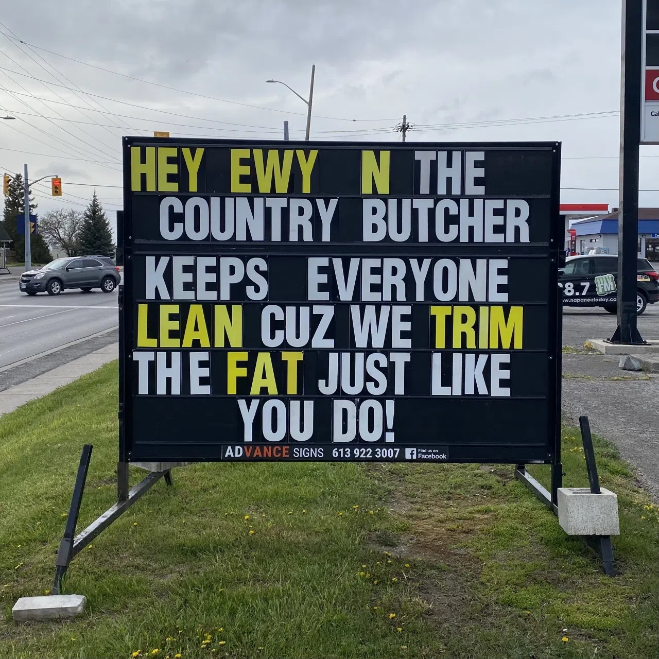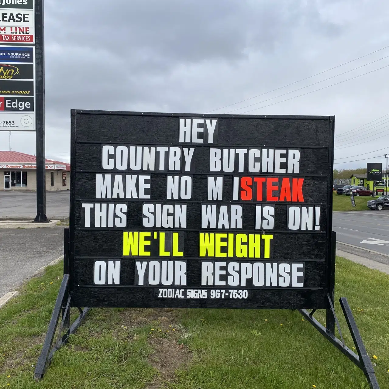 A sign war has begun in the same plaza between EWYN Weight Loss Studios against the Country Butcher.